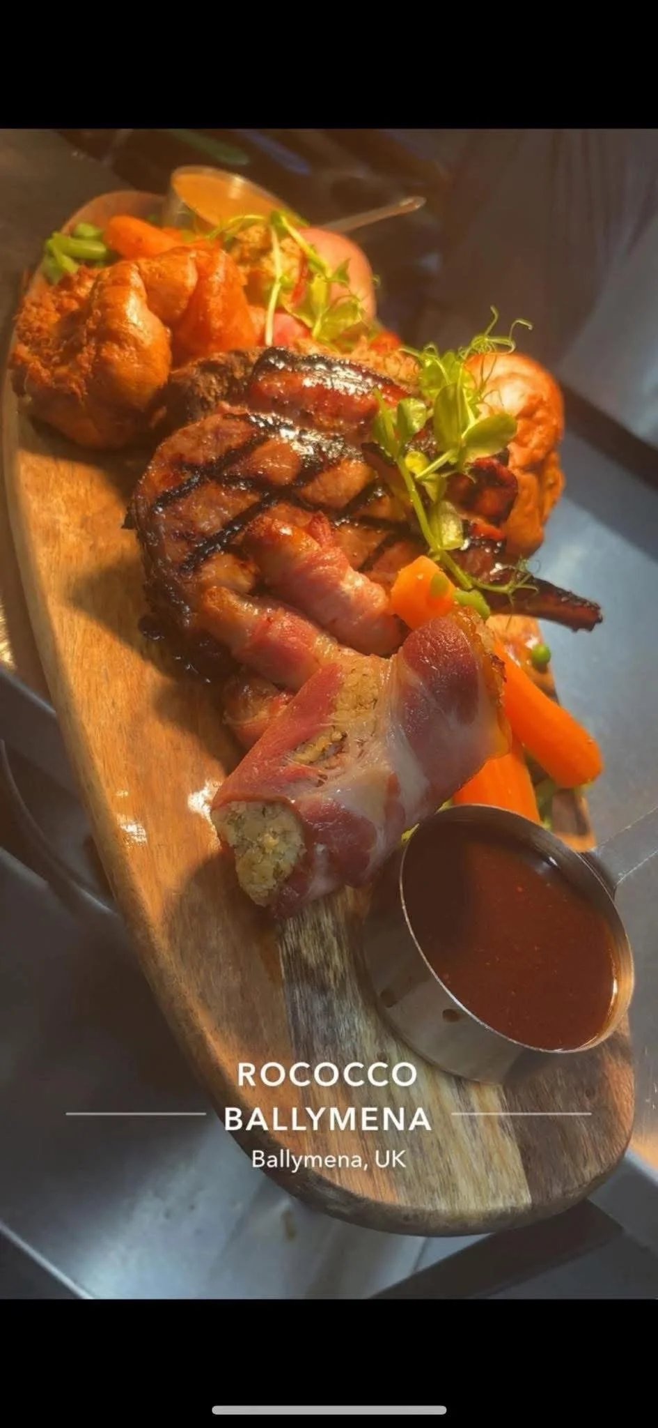 16hr braised beef brisket, char grilled chicken breast, sugar pit pork chop, Yorkshire pudding, pigs in blankets & stuffing rolls Roast potatoes, creamy mash, chefs selection of vegetables & gravy